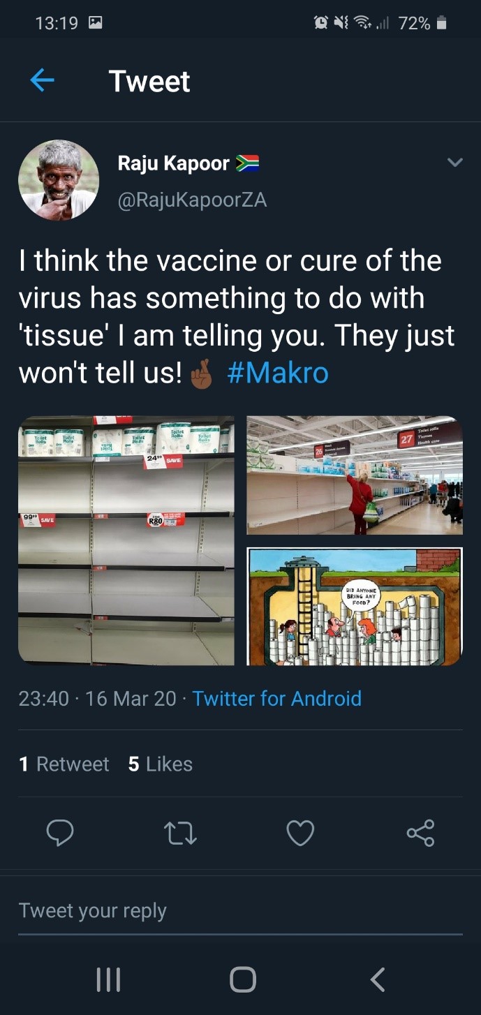 Personally, I don’t see anything wrong with people planning ahead. Italy, a country with a population exceeding that of South Africa is on a lockdown. This would concern even those with the “Let’s play it by ear” mentality. I am a mother to 2 super-active-growing boys, courtesy of their Monday to Monday physical activities. They eat like sumo wrestlers. I enjoy cooking and often I plan meals days in advance (a privilege as millions go without food daily). Their school holidays have now been stretched to a whole month and I needed to ensure we have enough supplies to lessen my trips to the grocery store. We are encouraged to exercise Social Distancing after all. I had planned to go to Makro last week Monday after gym and I found various reasons to postpone. Instincts were at play, imagine my relief upon seeing the #Makro on Twitter later that afternoon.